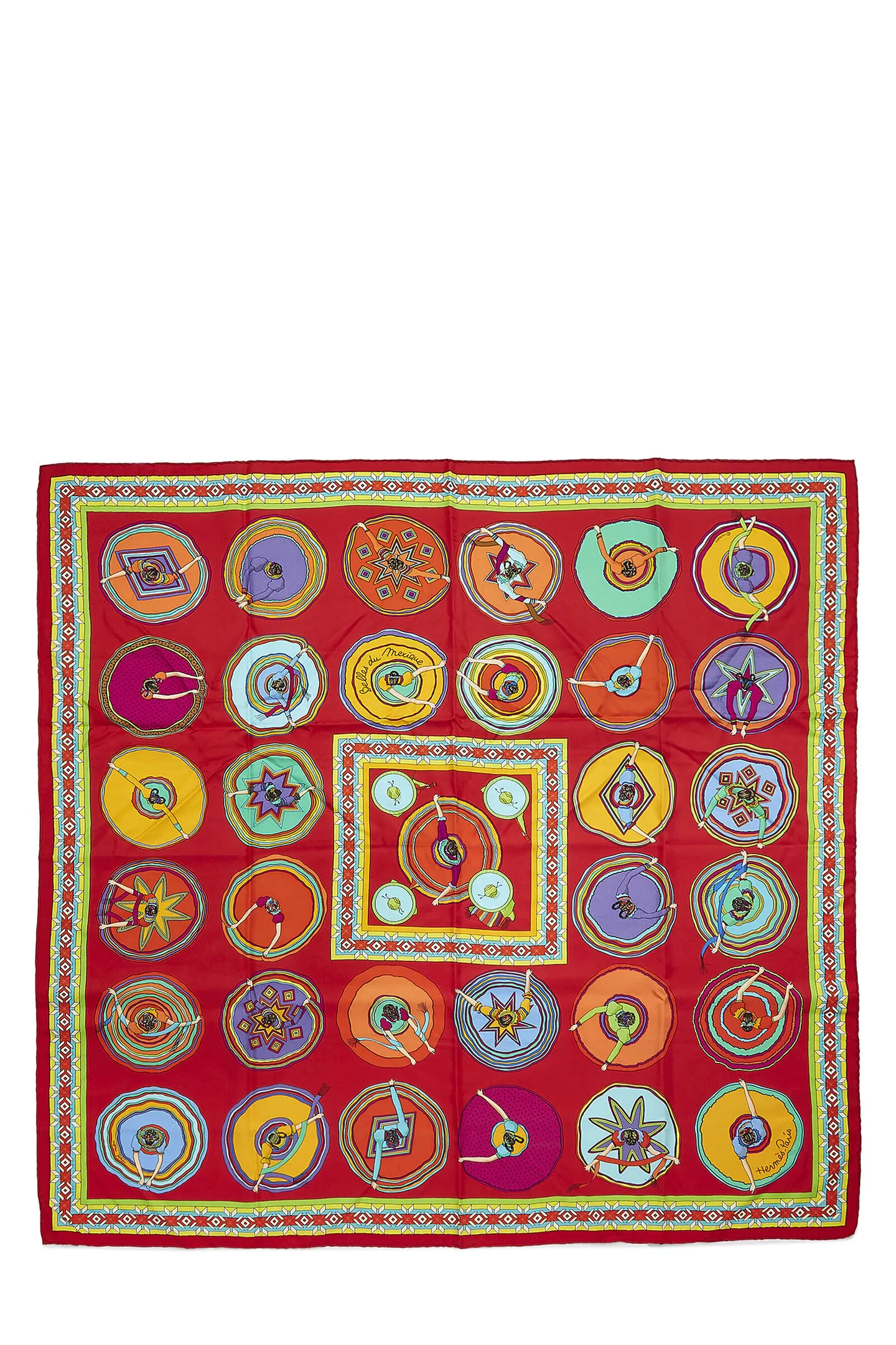 “Belles Du Mexique”; the beautiful dancing ladies of Mexico, is a collectible statement Hermès silk scarf by the Maison that conjures the brand’s artistry and evident craftsmanship executed by designer Virginie Jamin.