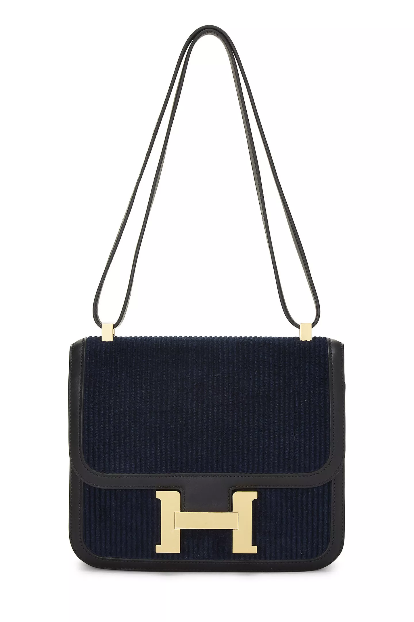 The Hermès Constance is known for its sophistication and infinite opulence, and this Hermès shoulder bag version in Blue Marine navy corduroy and signature H-shaped gold hardware only adds to the sleekness and glamour of the luxury Constance bag.