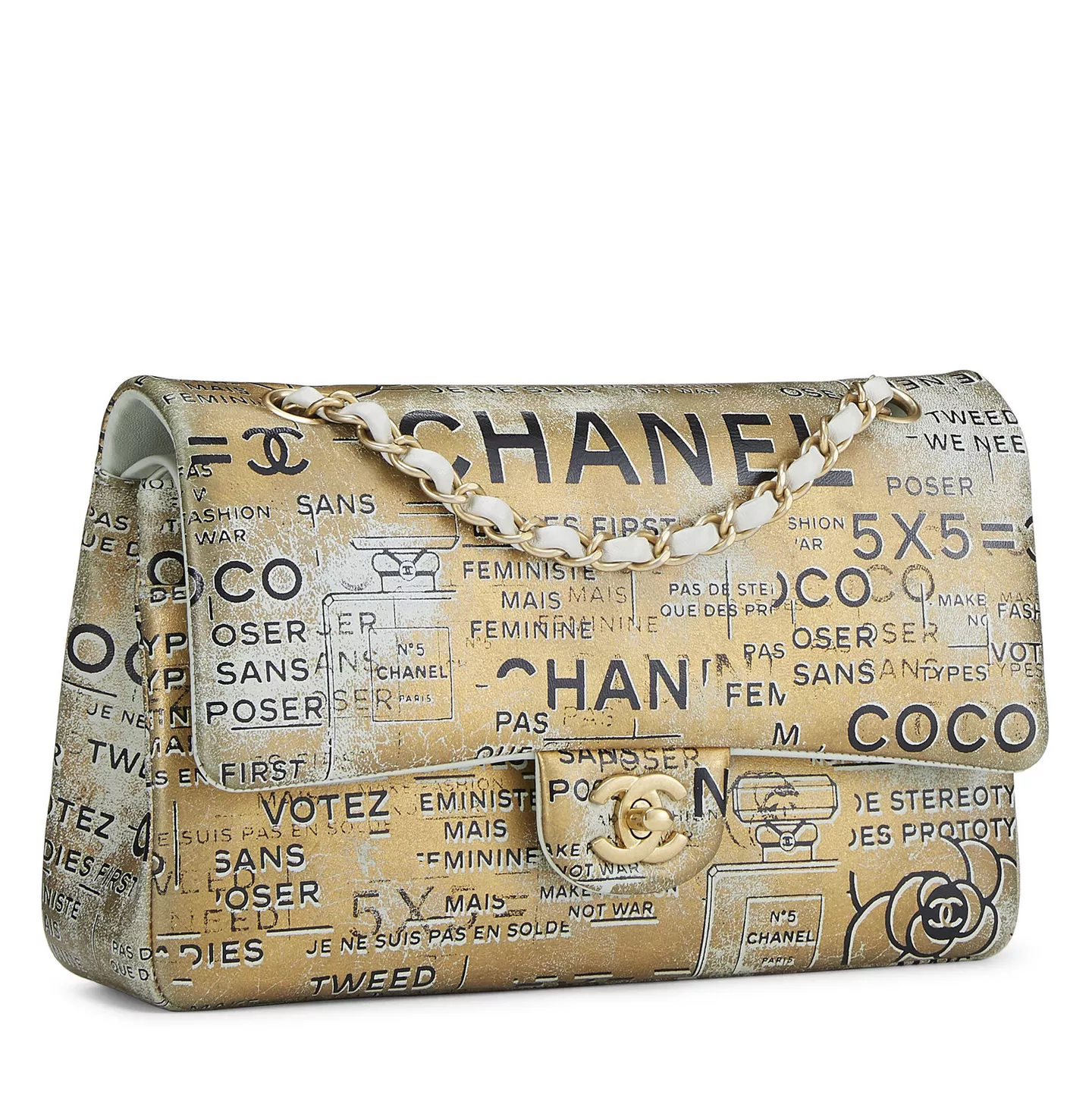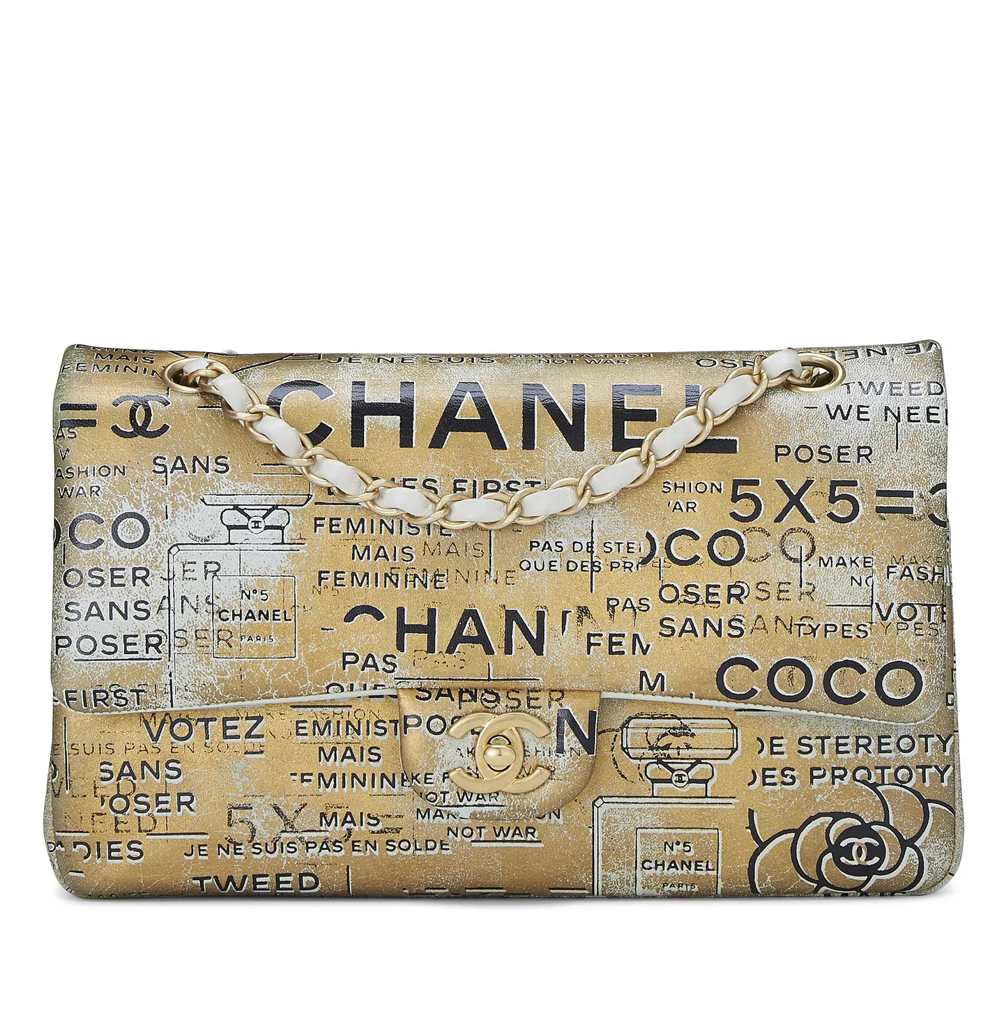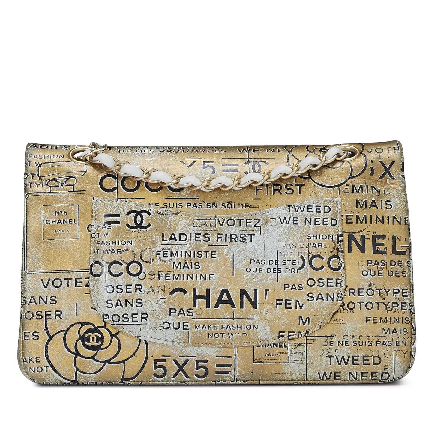 One of the higher-end bags in this collection is a metallic Newsprint Flap bag, covered in signature logos and feminist slogans. The graffiti newspaper print is one of the rarest and most unique Flap bags Chanel has ever released. It was made in four different variations—all painted carefully by hand. It was also famously modeled by Giselle Bündchen in the brand's S/S '15 "Afterdark" campaign. This limited edition runway piece was only available for a select few to purchase, and we are lucky enough to have one in stock. The ultimate gift for the ultimate collector—you'll want to grab this before it's too late.